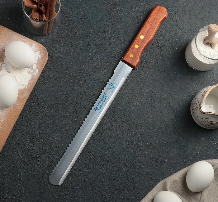 Нож для бисквита двусторонний, край ровный и с зубцами 25 см